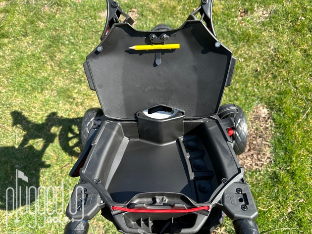 Moving to the interior of the console, it’s large enough for a wallet and keys, but it’s not so big and deep that things aren’t easily accessible. You can also see three dedicated spaces for golf balls on the right side of the compartment and a pencil clip on the cover. Finally, there’s a device holder at the back of the console. The red bungee holds your phone or GPS in place, allowing you to be more hands free during your round.