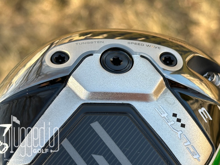 In the bag, the Callaway Elyte Triple Diamond fairway wood looks almost identical to the Elyte fairway wood, save for two things. First, there are the namesake black diamonds under the “Elyte” branding. Second, there’s a “forward weight screw” on the Step Sole which indicates that this club is designed with a forward CG for lower spin.