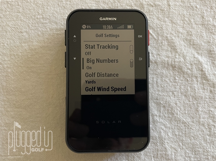 The Approach G20 came fully charged, but I set it outside in the sun for a few hours to learn more about the solar charging aspect. As an engineer I love the Solar screen with graphics that display solar intensity and charging over the past 6 hours. Solar charging occurs whether the unit is on or off. Garmin states that the G20 will operate for 30 rounds on a full battery. All of that is huge for me – I’ve been getting about 2 rounds with my Bushnell.