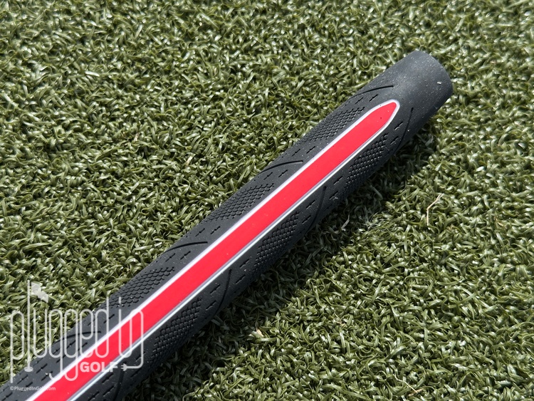 The back is where this grip shows its personality.  The red ALIGN stripe down the back is unmistakeable.  It’s hard to say whether this feature feels as bold as it looks or vice versa.  Either way, everyone who sees your club twirl will know that you have something unusual in your hands.