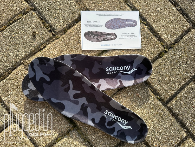 To promote comfort on and off the course, the Greyson X Saucony Shadow 5000 golf shoes come with two different sockliners. Per Saucony, a “molded EVA insert [provides] greater support for on course while the SRS Sockliner options provides a soft underfoot for off course.” While I love having options, I didn’t find a substantial difference between the two sockliners. When I was A/B testing, I felt a small difference, but neither one stood out as being significantly better or worse, softer or firmer.