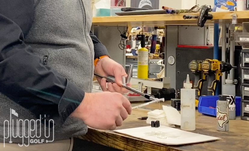 Step 5: Put epoxy into hosel and onto shaft. Using a slim screwdriver or whatever you used to mix the epoxy, put a generous helping of epoxy into the club’s hosel. Follow that up by putting more epoxy on the shaft. Similar to Step 2, you can only under-do this step, you can’t over-do it.