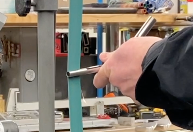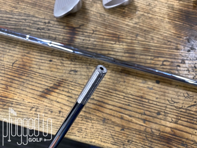 Step 3: Prep the shaft. Using either sandpaper in your hand or a belt sander, start to remove the finish/paint from the shaft. With a steel shaft, it’s nearly impossible to go too far. With graphite, it’s very easy to go too far. You know that a shaft is well-prepped when the chrome or paint has been removed from the shaft (see above).