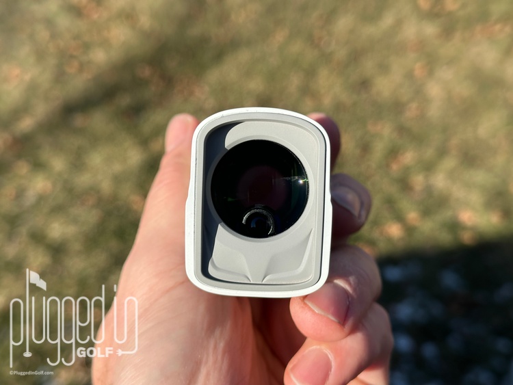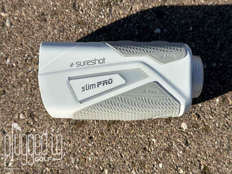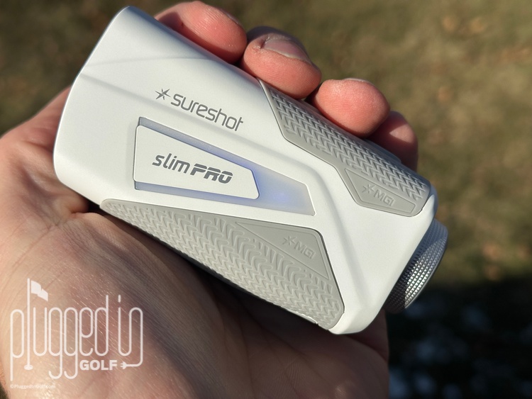 In terms of features, the SureShot SlimPRO has the basics. It has slope adjustment, PinLoc, and Priority Loc – the ability to ignore background targets. In 2025, these are de rigueur. The 7X magnification is solid, and MGI claims water resistance, but doesn’t state to what standard. One added feature I do like is that the light on the side of the unit glows blue when slope is turned off, red when it’s turned on.