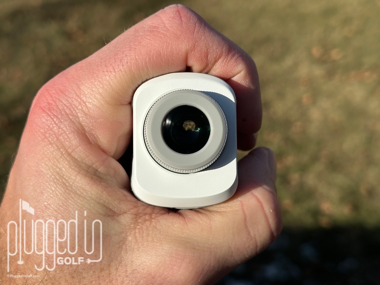 The primary selling point of the MGI SureShot SlimPRO rangefinder is its size, so we’ll start there. It’s under 4″ long and less than 2″ tall and wide. It weighs a touch over five ounces, which is among the lightest lasers you’ll find. The other two comparably-sized rangefinders – the Voice Caddie Laser FIT and Mileseey IONME2 – are one ounce lighter and heavier, respectively, but have slightly more traditional, rectangular shapes. The SureShot SlimPRO is almost square, as you can see below, which makes it feel smaller in my hand.