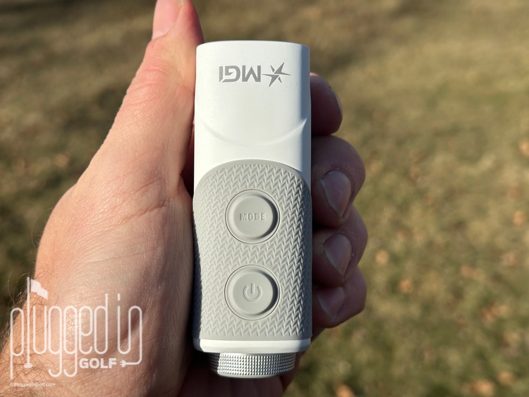Nothing about the MGI SureShot SlimPRO rangefinder will be unfamiliar for golfers who have used rangefinders in the past. There are two buttons on top: Power and Mode. The first press of the Power button turns the device on, the second gets your distance. Turning to the Mode button, a single tap toggles the pulse function, a double tap turns slope adjustment on or off, and a 10-second hold changes the units of measurement.