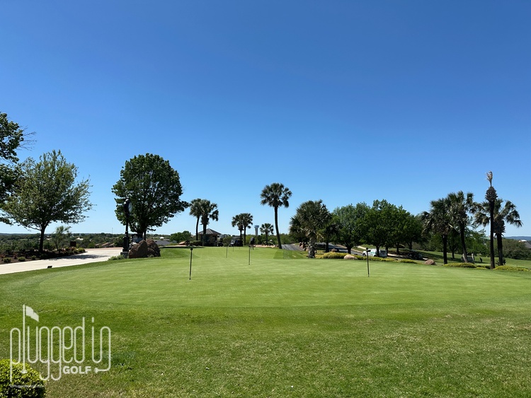 Steps from the clubhouse and the starter’s hut is the expansive driving range. It features two enormous tiers of grass hitting areas and a strip of artificial turf for warming up when the grass is unplayable. This all looks down on numerous target greens. I typically prefer a flatter driving range to accurately gauge my distances, but, given the extreme elevation changes on these courses, a downhill range makes sense here. At the other end of the range, you can see the Golf Academy at Horseshoe Bay.